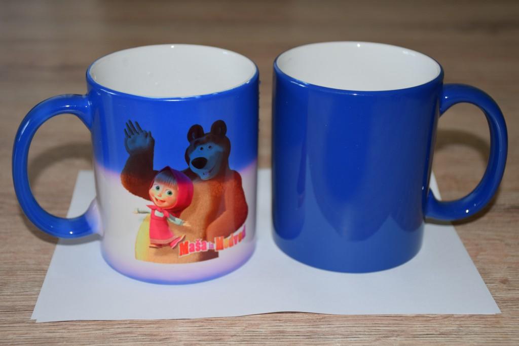 Magični lonček modre barve -sijaj, spremeni barvo ko vanj nalijemo vročo tekočino (čaj ali kavo), takrat se tudi pokaže natiskan motiv. H 95 mm / ø 82 mm. Primeren za ročno pomivanje. Pokritost, ko je hladen je 70%.